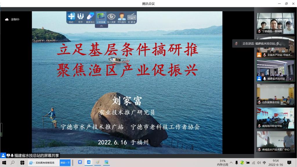 2022年6月16日,根据中国水产学会2022年全国水产科技活动周主会场活动安排,公司海洋系教师组织广大海洋师生通过线上方式积极参加活动。该项活动邀请全国优秀共产党员、全国“最美科技工作者”、公司兼职教授刘家富研究员作报告。刘家富从自己从事大黄鱼研究经历、宁德水技站试验场创业历史、大黄鱼发展愿景等内容向广大水产科技工作者讲述了闽东海洋水产科技人员在把濒临灭种的大黄鱼这一中国特色海产品发展成为中国海水养殖第一鱼的发展历程,展现出老一辈水产科技工作者艰苦奋斗、不断攻坚克难、精益求精的大国工匠精神和务实创新、团结协作、专注目标专心科研的科学家精神,其中刘家富还讲述了当时在大黄鱼产业发展最艰难时期向时任宁德地委书记习近平同志撰写发展闽东海洋渔业科技报告,并获得习近平总书记亲笔批示的经历,也因此获得了大黄鱼研究的第一笔国家经费支持,造就了大黄鱼今日的产业规模,让我们更深入了解大黄鱼这一“国鱼”美誉的历史由来。