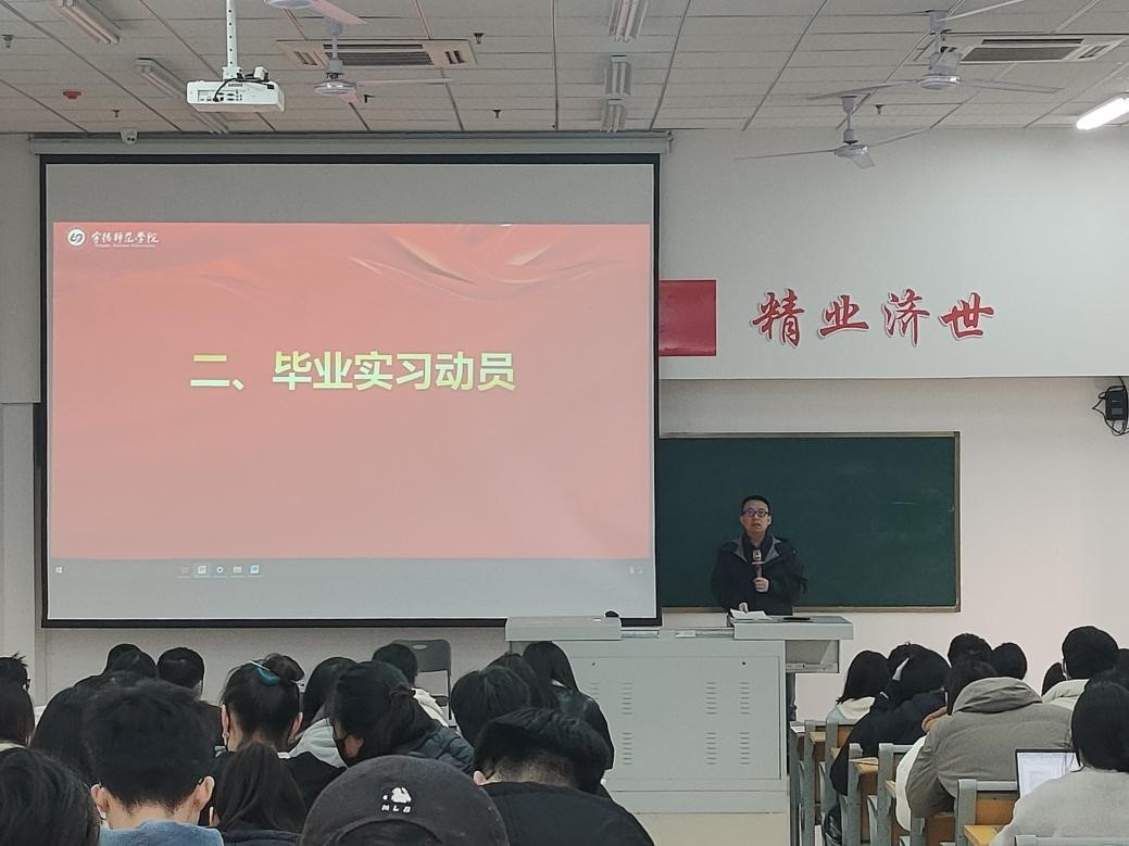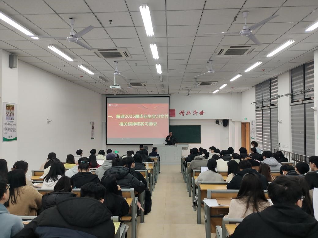 会上,刘春雷老师解读2025届毕业生实习文件相关精神和实习要求,包括实习时间、实习地点、实习材料撰写要求等,确保每位毕业生都能了解自己的职责和任务。同时,他还介绍公司已合作的实习单位情况,帮助毕业生们更好地了解并选择适合自己的实习岗位。