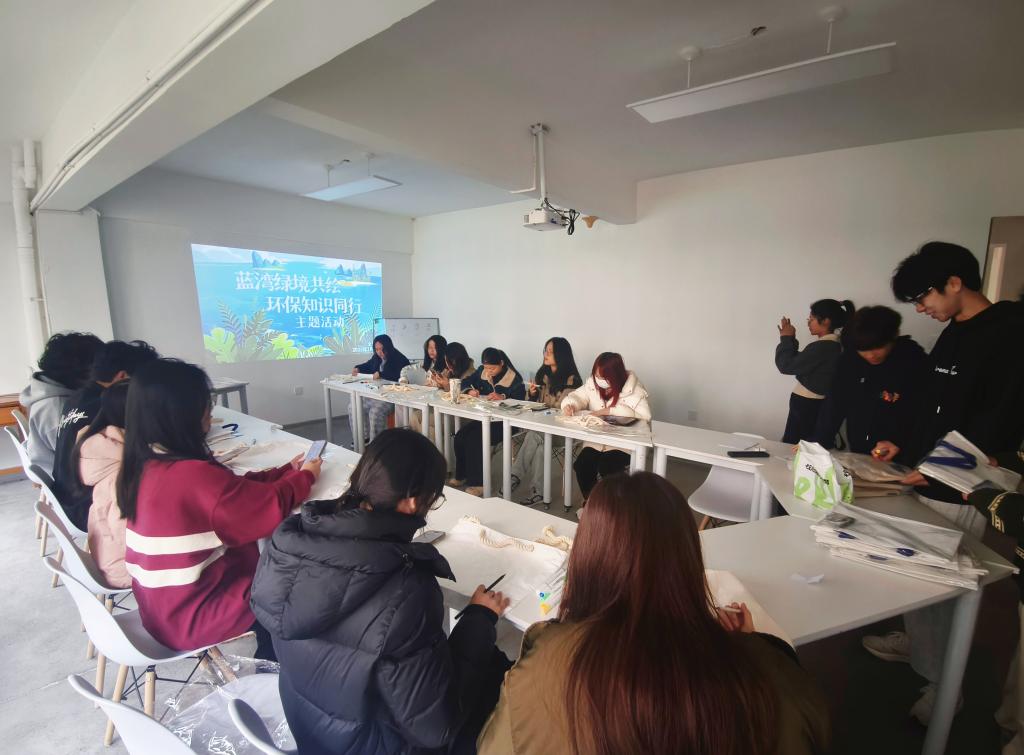 活动开始,工作人员将在场同学们随机分5组,每组3人。每组派一位同学加入学习通课堂用于抢答。现场,同学们聚精会神,眼睛紧盯着屏幕,迅速捕捉题目要点,答对时欢呼,答错时也不气馁。激烈的知识抢答赛结束后,工作人员给每一位同学发放帆布包,丙烯马克笔等绘画材料。在教室里,同学们围坐桌前,神情专注,桌上颜料、画笔摆放整齐。大家构思着海洋元素,蘸取颜料,细致涂抹。不一会儿,斑斓珊瑚、灵动游鱼跃然包上,每一笔都饱含对海洋的热爱,彰显守护绿色生态的决心。每一位同学都感受到了知识,艺术和海洋文化相结合所带来的独特魅力与无穷乐趣,彼此之间的友谊也在欢声笑语中得到进一步增进。