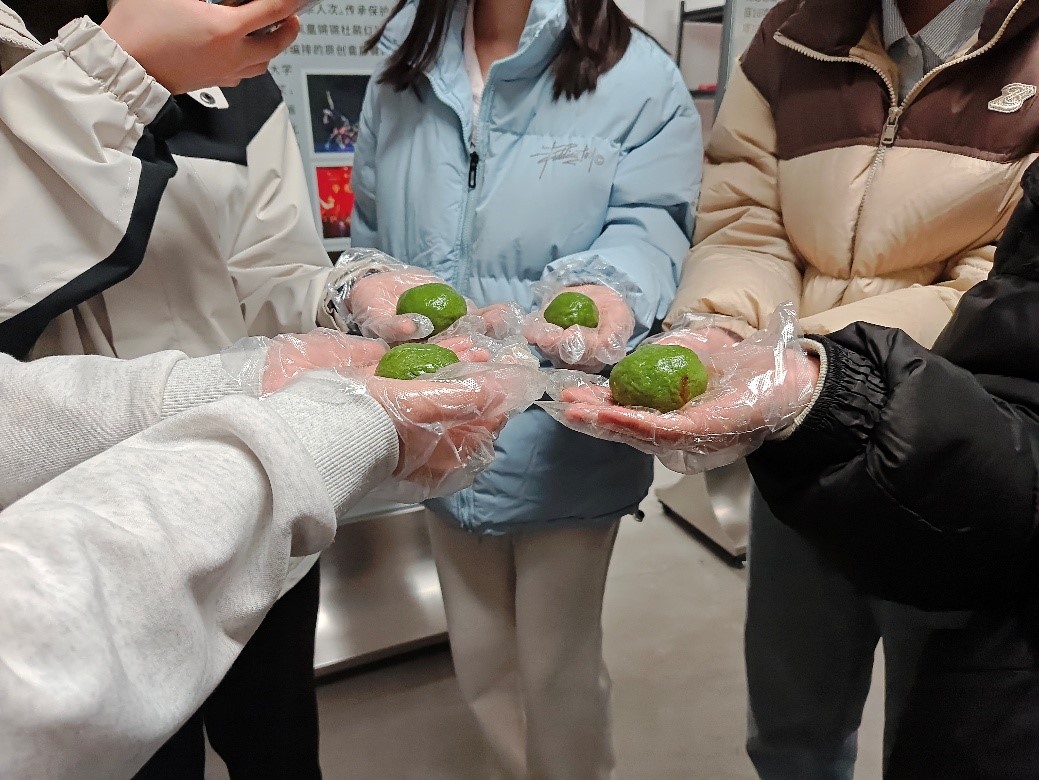 青团制作环节,是创意与美食的碰撞时刻。工作人员向参与活动的同学们详细介绍了青团的制作方法,并现场演示了和面、包馅、成型的步骤。同学们根据活动现场准备的材料青团粉、咸蛋黄、豆沙馅、肉松等,发挥自由想象,制作出独具风味的青团。这不仅是一次美食的制作,还是优秀传统文化记忆的传承。在工作人员的悉心指导下,活动现场洋溢着浓厚的实践氛围。部分同学手法娴熟,揉面、包馅一气呵成,做出的青团外形圆润饱满,尽显专业水准。而初次尝试的同学们则自发组成互助小组,你揉面我包馅,在协作中不仅完成了作品,更体会到团队合作的乐趣。最后的成品展示环节,是分享与提升的时刻,也是文化技艺的传承时刻。