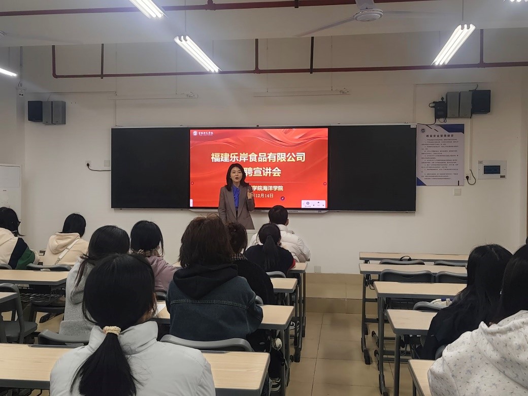 为进一步提升公司毕业生就业质量,拓宽员工的职业视野,2024年12月14日在医教楼602开展福建乐岸食品有限公司就业招聘宣讲会,为2025届毕业生提供优质的就业与实习机会,推动公司员工高质量充分就业。