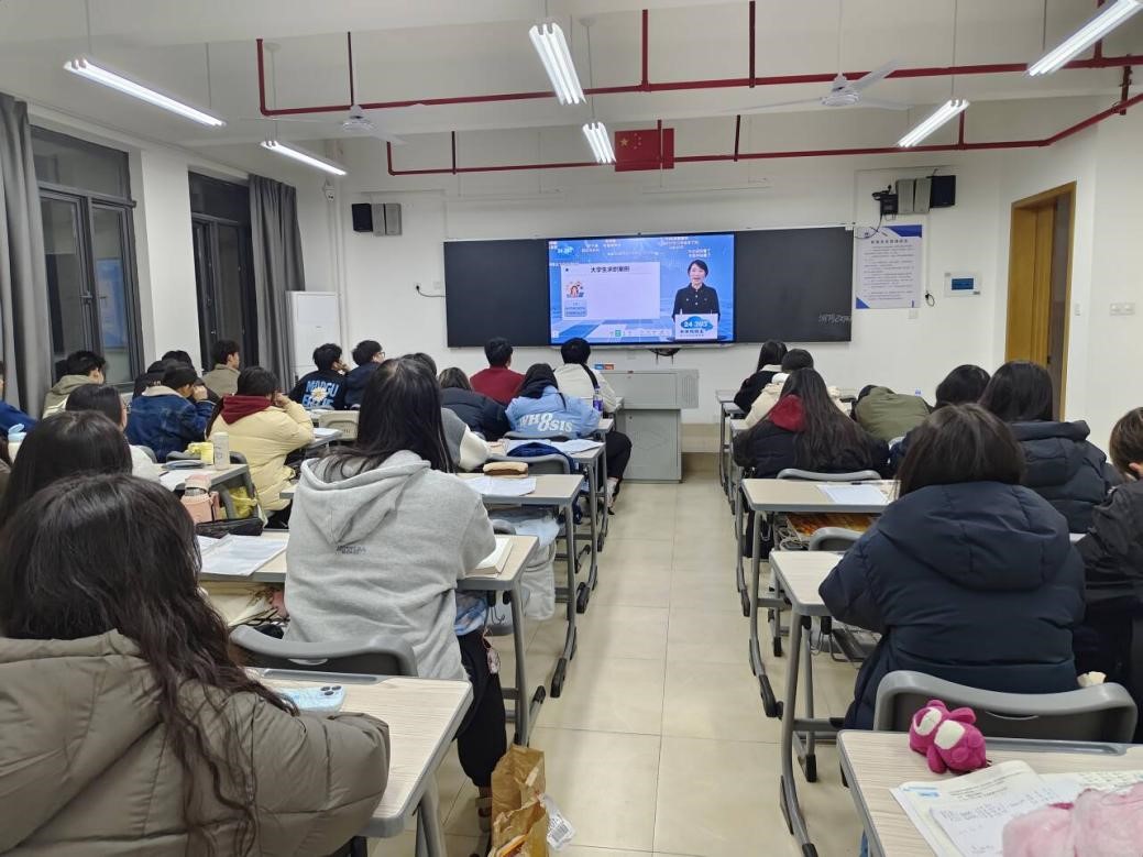 2025年3月9日PA视讯集团官方网站2024级食科专业员工在医教楼603场地观看教育部“互联网+就业指导”公益直播课——“找到专业机会点 透视目标路径图”