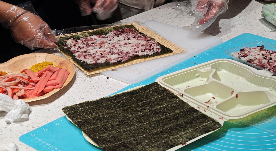 活动当日,参与的同学们准时到达场地,现场热闹非凡。在工作人员对寿司制作方法进行了简短讲解后,便进入了令人期待的制作环节。